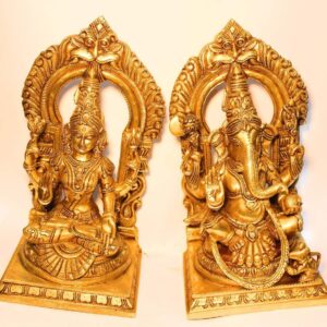 This exquisite Brass Laxmi Ganesh on Lotus idol is a masterpiece of traditional craftsmanship, radiating divine grace and spiritual energy. Meticulously handcrafted from pure brass, the idol features Lord Ganesha, the remover of obstacles, and Goddess Laxmi, the harbinger of wealth and prosperity, both seated gracefully on beautifully carved lotus thrones – symbolizing purity, growth, and enlightenment. With a height of 25 cm and a weight of 8 kgs, this idol carries remarkable detailing and a majestic presence, making it a perfect centerpiece for home temples, living rooms, or offices. The heavy brass structure ensures durability and a long-lasting spiritual aura, while its intricate artistry enhances the sacred ambiance of any space. Ideal for worship, festive rituals, housewarming gifts, or simply as a decorative statement, this idol embodies auspiciousness, devotion, and prosperity in its finest form.