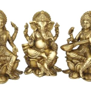 This exquisite brass Laxmi Ganesh Saraswati idol beautifully combines the divine presence of Goddess Laxmi, Lord Ganesha, and Goddess Saraswati in a single frame, symbolizing prosperity, wisdom, and success. Crafted from high-quality solid brass, the idol showcases intricate detailing and fine craftsmanship, making it a timeless piece of devotional art. With a height of 12 cm and a weight of 1.9 kgs, it holds a substantial presence despite its compact size, making it ideal for home temples, office desks, or as a thoughtful gift for auspicious occasions. Its antique finish adds a touch of elegance, enhancing its spiritual and decorative appeal.