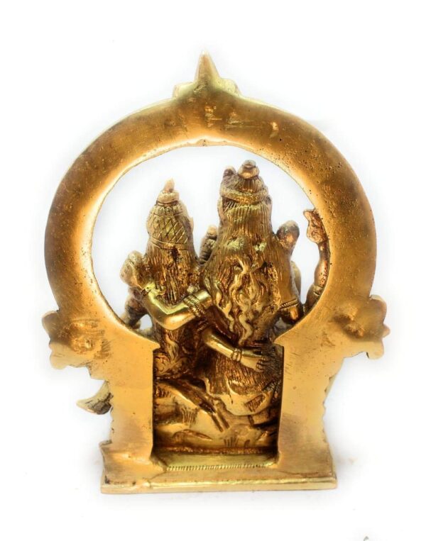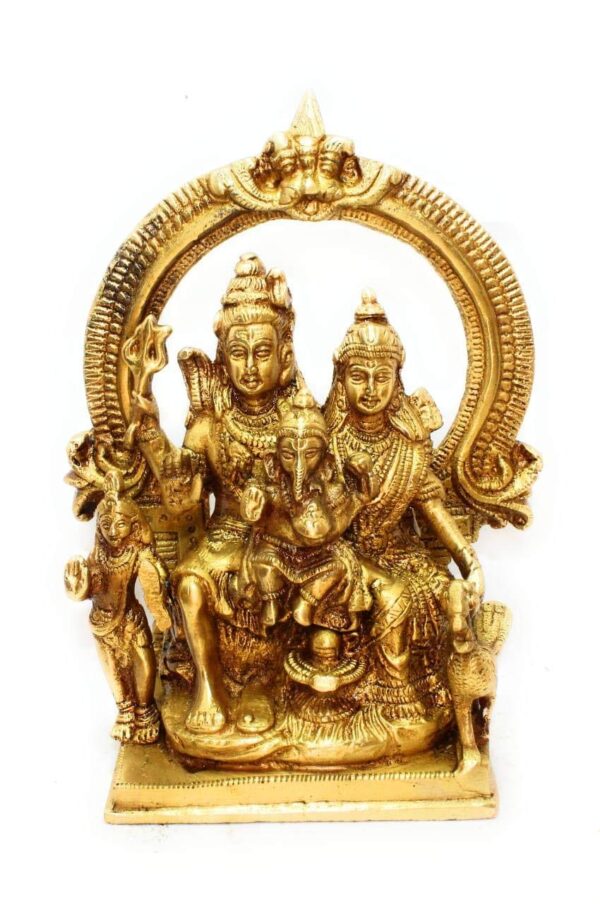 This beautifully crafted Brass Shiv Pariwar idol captures the divine presence of Lord Shiva, Goddess Parvati, and Lord Ganesha together, symbolizing family unity, prosperity, and protection. Standing at a height of 19 cm and weighing 1.95 kgs, the idol is intricately detailed with fine craftsmanship, making it a perfect addition to your home temple, decor, or as a spiritual gift. The warm golden brass finish adds an aura of grace and devotion to any space.