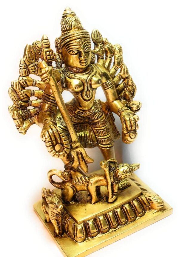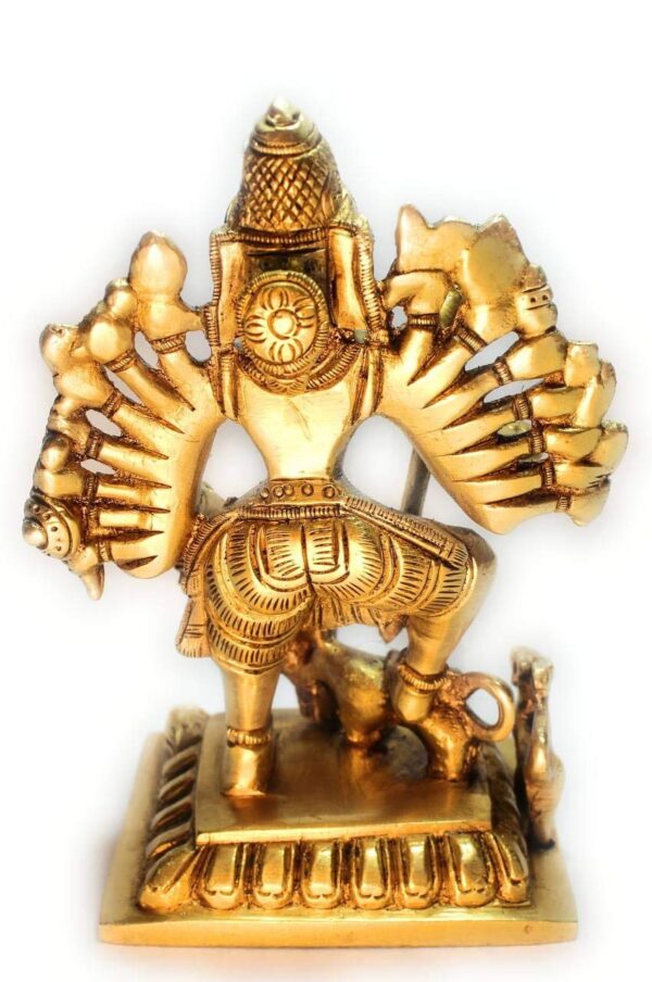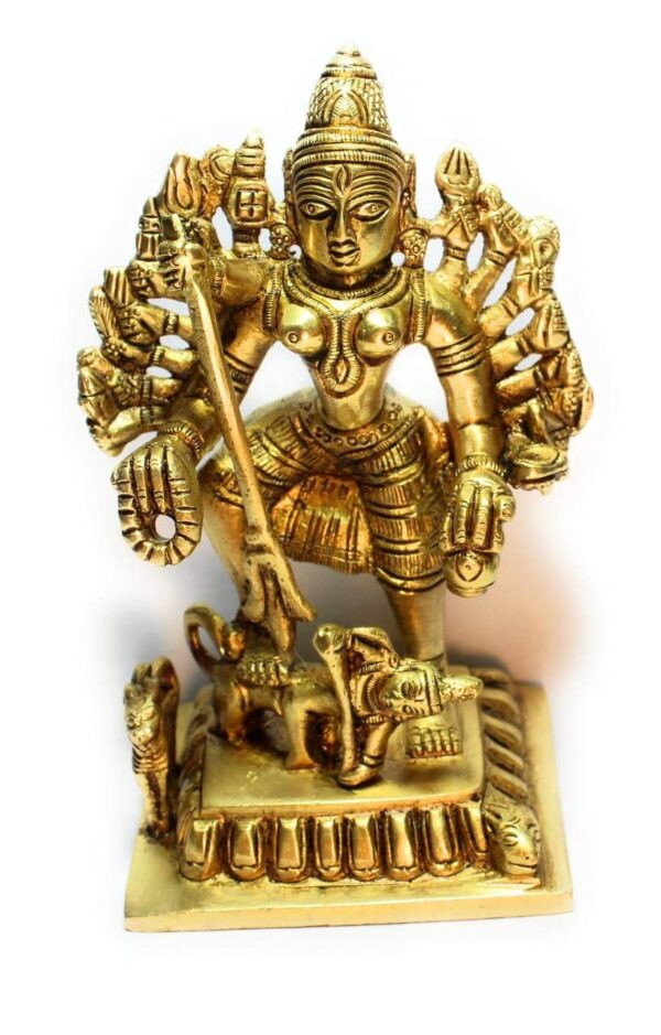 This exquisite Brass Kali idol is a finely crafted piece that beautifully captures the fierce yet divine form of Goddess Kali. Standing at a height of 12 cm and weighing 500 grams, this idol showcases intricate detailing in facial expressions, ornaments, and posture, symbolizing her power to destroy evil and protect her devotees. Made from high-quality brass, it exudes a rich golden sheen, making it a perfect addition to your home temple, meditation space, or as a decorative centerpiece. Its compact size makes it ideal for gifting during festivals or spiritual occasions, carrying the essence of devotion and strength in a beautifully artistic form.