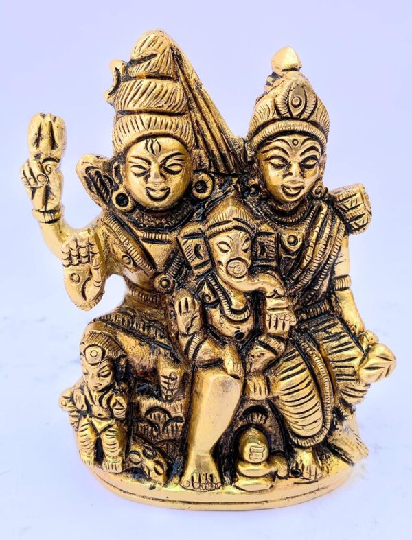 This beautifully crafted Brass Shiv Parivar Idol captures the divine essence of Lord Shiva, Goddess Parvati, and Lord Ganesha together, symbolizing unity, love, and prosperity. Handcrafted from premium quality brass, this idol radiates traditional charm and spiritual significance. Its compact size makes it perfect for home temples, office desks, or as a sacred gift for auspicious occasions.