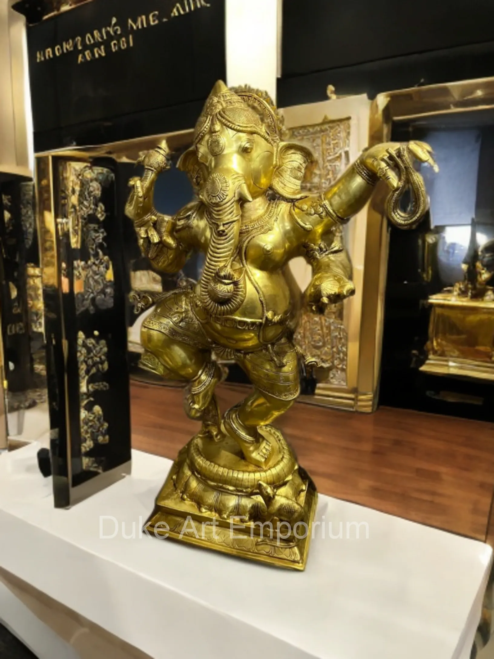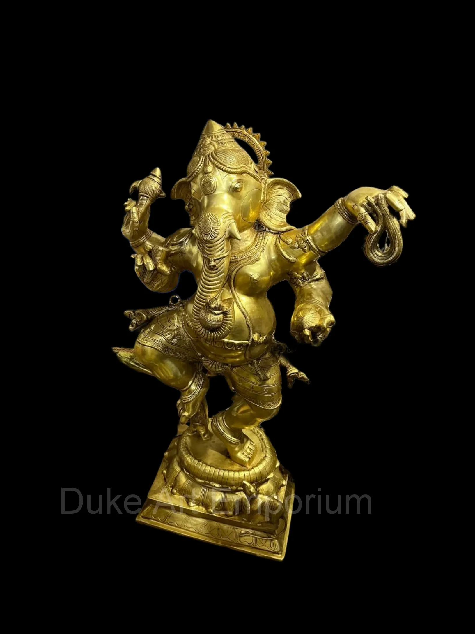This exquisite Brass Dancing Ganesha idol is a magnificent representation of divinity and artistic mastery. Standing at an impressive 30 inches in height, with a length of 20 inches and width of 11 inches, this handcrafted masterpiece weighs approximately 35.5 kilograms, reflecting its solid brass construction and detailed craftsmanship. The idol captures Lord Ganesha in his energetic dancing form, a symbol of joy, celebration, and the dynamic rhythm of the universe. Every detail, from the expressive features to the intricate adornments, is finely sculpted to bring spiritual charm and visual grandeur to your home, temple, or decor space. Ideal as a centerpiece for traditional settings or as a sacred addition to your collection, this idol embodies prosperity, creativity, and divine energy.