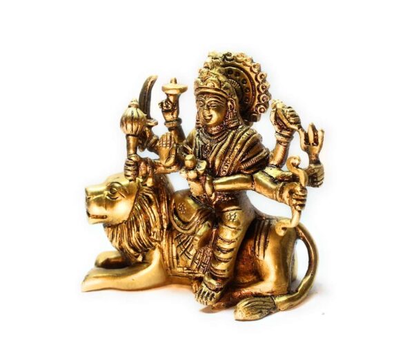 This exquisite Brass Durga Idol sitting on Lion is a symbol of power, strength, and divine protection. Crafted with fine detailing, the idol captures Goddess Durga in her majestic form, seated gracefully on her lion. With a height of 11 cm and a weight of 680 grams, this piece is perfect for home temples, spiritual spaces, or as a decorative collectible. Its antique brass finish adds a touch of traditional elegance, making it a meaningful gift for festive occasions and housewarmings.