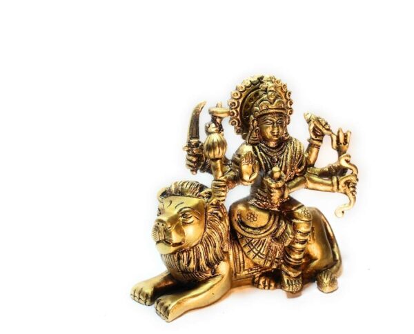 This beautifully crafted Brass Durga idol sitting on Lion is a divine masterpiece that radiates strength, courage, and positivity. Made with high-quality brass, the idol showcases Goddess Durga in a seated posture on her majestic lion, symbolizing the victory of good over evil. With a height of 11 cm and a weight of 680 grams, it is compact yet sturdy, making it perfect for your home temple, office desk, or as a decorative centerpiece. The fine detailing on the idol enhances its charm, reflecting skilled craftsmanship and devotion. This idol is not only a symbol of spiritual energy but also an elegant piece of art that brings prosperity, protection, and harmony to your surroundings.