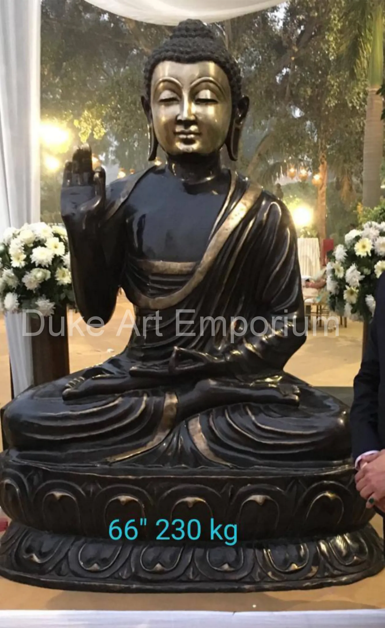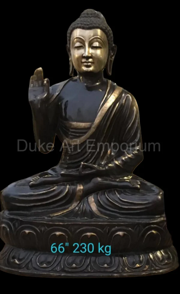 Elevate your space with the divine presence of this majestic Brass Buddha statue in a striking black finish. Standing tall at 64 inches, with a commanding length of 46 inches and a width of 26 inches, this masterpiece weighs an impressive 250 kilograms, reflecting its grand scale and solid craftsmanship. Meticulously handcrafted by skilled artisans, every detail of the Buddha’s serene expression, flowing robes, and meditative posture exudes peace, wisdom, and spiritual energy. The black finish adds a touch of contemporary elegance to the traditional design, making it a perfect centerpiece for luxurious interiors, gardens, spiritual retreats, or meditation rooms. This statue is not just a decorative piece, but a symbol of tranquility and inner harmony, sure to draw reverence and admiration wherever placed.