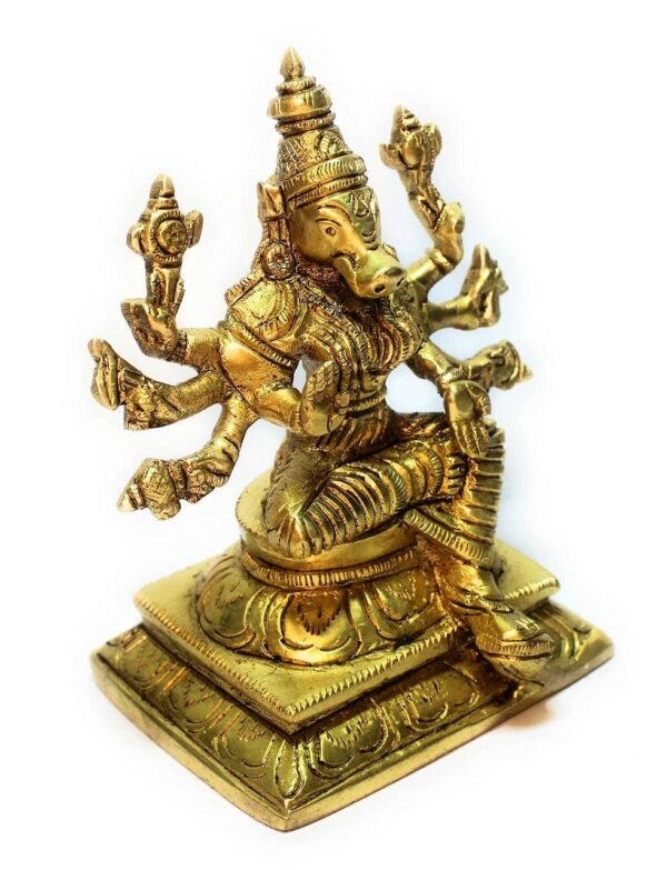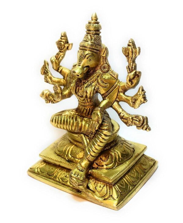 This elegant Brass Varaha idol, measuring 12 centimeters in height and weighing approximately 0.750 kilograms, is a fine representation of Lord Vishnu’s third incarnation as Varaha—the divine boar who rescued Mother Earth from the cosmic ocean. Crafted meticulously in solid brass, this idol radiates strength, divine protection, and spiritual significance. The detailing on the sculpture captures Varaha’s powerful form, holding Bhudevi (Earth Goddess), symbolizing the restoration of balance and the triumph of good over evil. Ideal for home altars, spiritual spaces, or as a unique decorative piece, this idol brings an aura of divine energy and reverence to any setting.