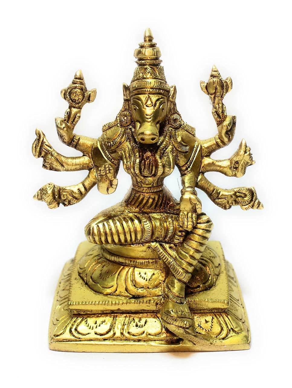 This beautifully handcrafted Brass Varaha Idol represents the third incarnation of Lord Vishnu in the form of a boar, symbolizing the triumph of good over evil. Standing at 12 cm tall and weighing 0.750 kgs, this divine sculpture captures intricate detailing and divine presence, making it a perfect addition to your home temple, décor collection, or spiritual altar. The idol radiates strength, protection, and balance, ideal for gifting and spiritual practices.